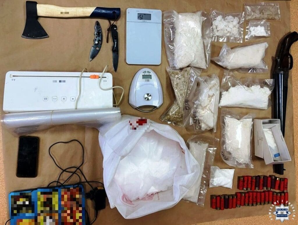 W mieszkaniu szybko okazało się, że podejrzenia funkcjonariuszy nie ograniczały się jedynie do drobnych przestępstw. Podczas przeszukania zabezpieczono kilka kilogramów białego proszku, który – według wstępnych ustaleń – może być metamfetaminą. Łączna waga substancji to około cztery kilogramy.