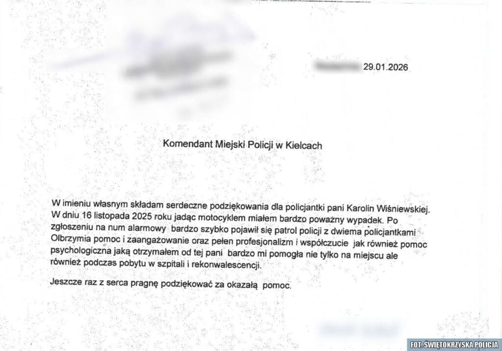 Do Komendy Miejskiej Policji w Kielcach wpłynęły pisemne podziękowania od mieszkańca regionu, który ucierpiał w poważnym wypadku motocyklowym. Autor listu postanowił w ten sposób wyrazić wdzięczność funkcjonariuszkom, które jako pierwsze dotarły na miejsce zdarzenia i udzieliły mu pomocy. Interweniujący patrol pełnił służbę w rejonie gminy Daleszyce.